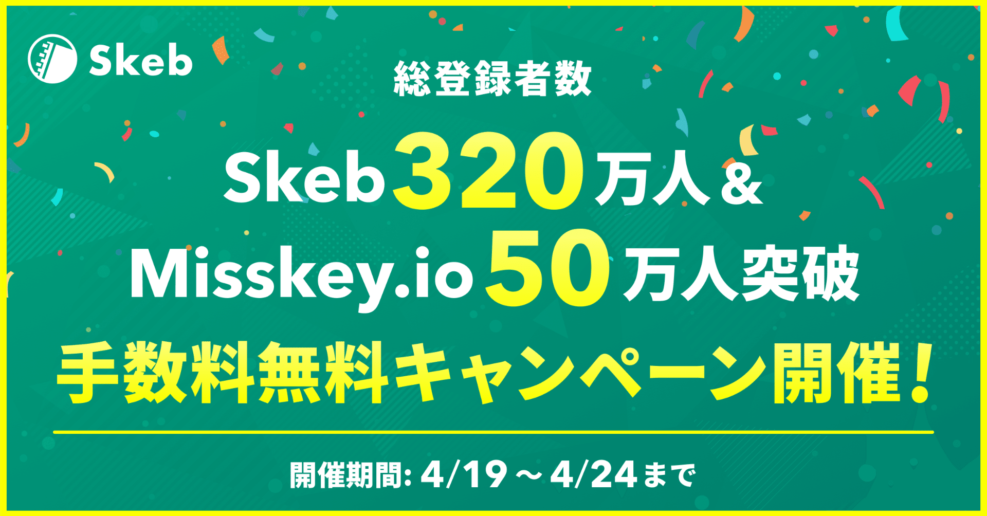 また現在Skebでは総登録者数320万人&Misskey.io50万人突破を記念した手数料無料キャンペーンを開催中。期間は4月19日0時から4月24日23時59分までの間に承認したリクエストとなる。